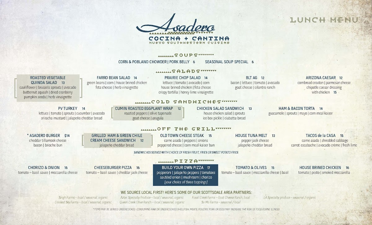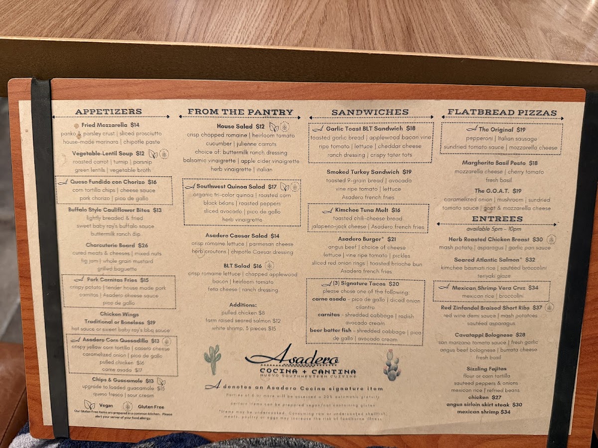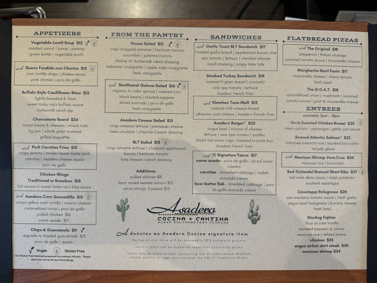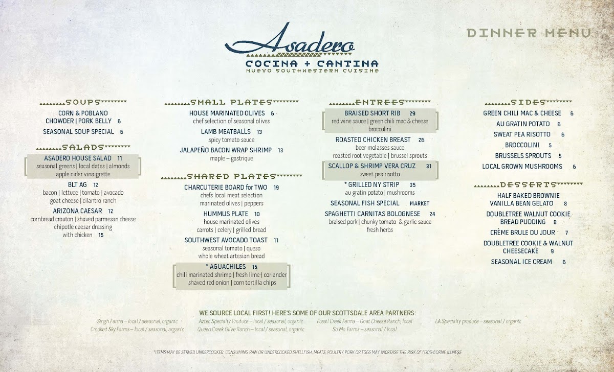 At Asadero Cocina Cantina, located on N Scottsdale Rd in Scottsdale, AZ, you'll find a vibrant blend of bold flavors and traditional recipes. This menu invites you to explore a variety of mouthwatering dishes, from sizzling fajitas to perfectly seasoned tacos, all made with the freshest ingredients. Whether you're in the mood for a light bite or a hearty meal, the options are both delicious and satisfying. Indulge in savory meats grilled to perfection, accompanied by zesty salsas and refreshing sides that will leave you craving more. Each dish is crafted to bring a taste of authentic Mexican cuisine straight to your table, and the warm, welcoming atmosphere makes it the perfect spot to enjoy a meal with friends or family. The Asadero Cocina Cantina Menu has something for everyone, making it a must-visit for anyone looking to enjoy delicious, flavorful food in Scottsdale.