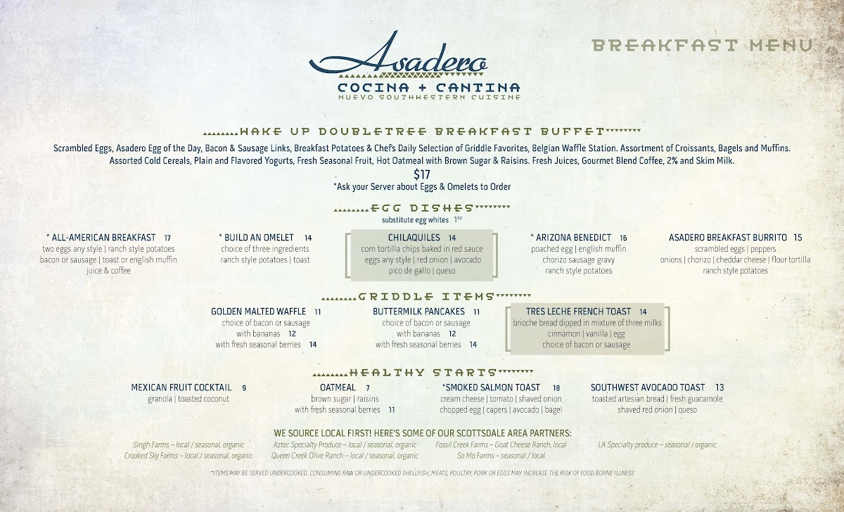 Scrambled eggs, asadero egg of the day, bacon & sausage links, breakfast potatoes & chef's daily selection of griddle favorites, belgian waffle station. Assortment of croissants, bagels and muffins. Assorted cold cereals, plain and flavored yogurts, fresh seasonal fruit, hot oatmeal with brown sugar & raisins. Fresh juices, gourmet blend coffee, 2% and skim milk. * Ask your server about eggs & omelets to order